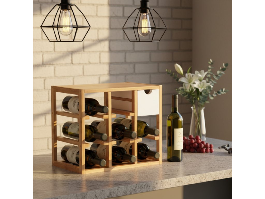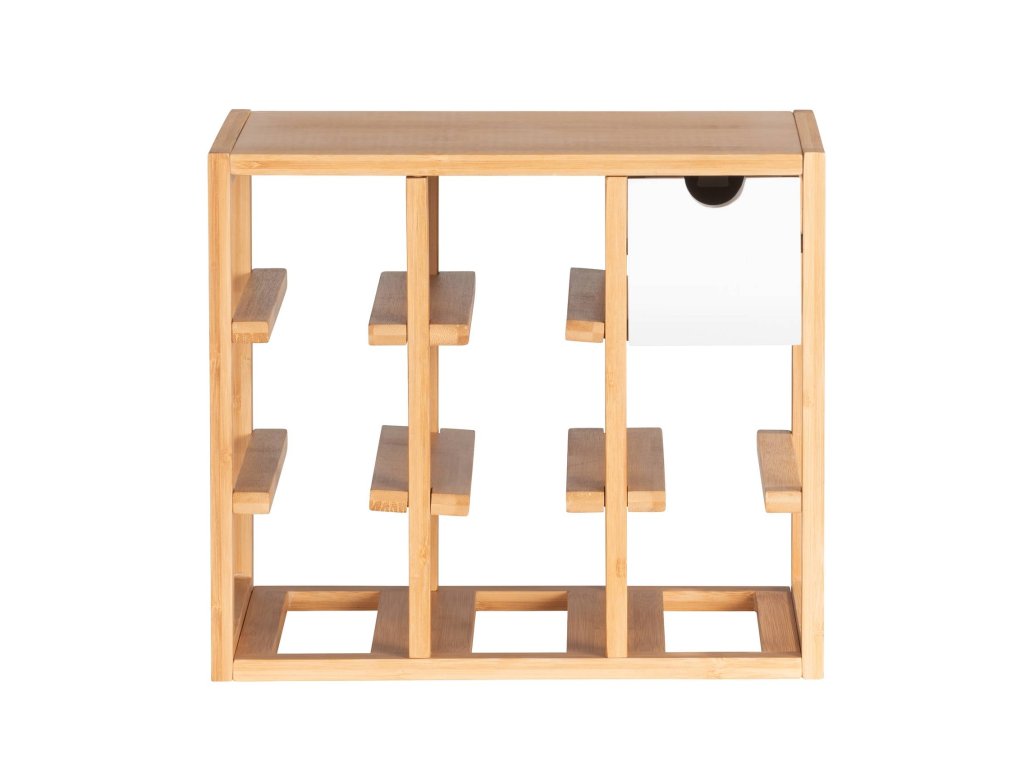 Bambusový stojan na víno FINJA byl vyroben z přírodního bambusového dřeva. Charakteristický tvar konstrukce a použitý materiál zajišťují, že tento předmět je odolný a stabilní, a skladované lahve leží bezpečně – což minimalizuje riziko jejich náhodného rozbití. Ve stojanu je místo pro několik lahví vína na profilovaných policích a uzavíratelná zásuvka.