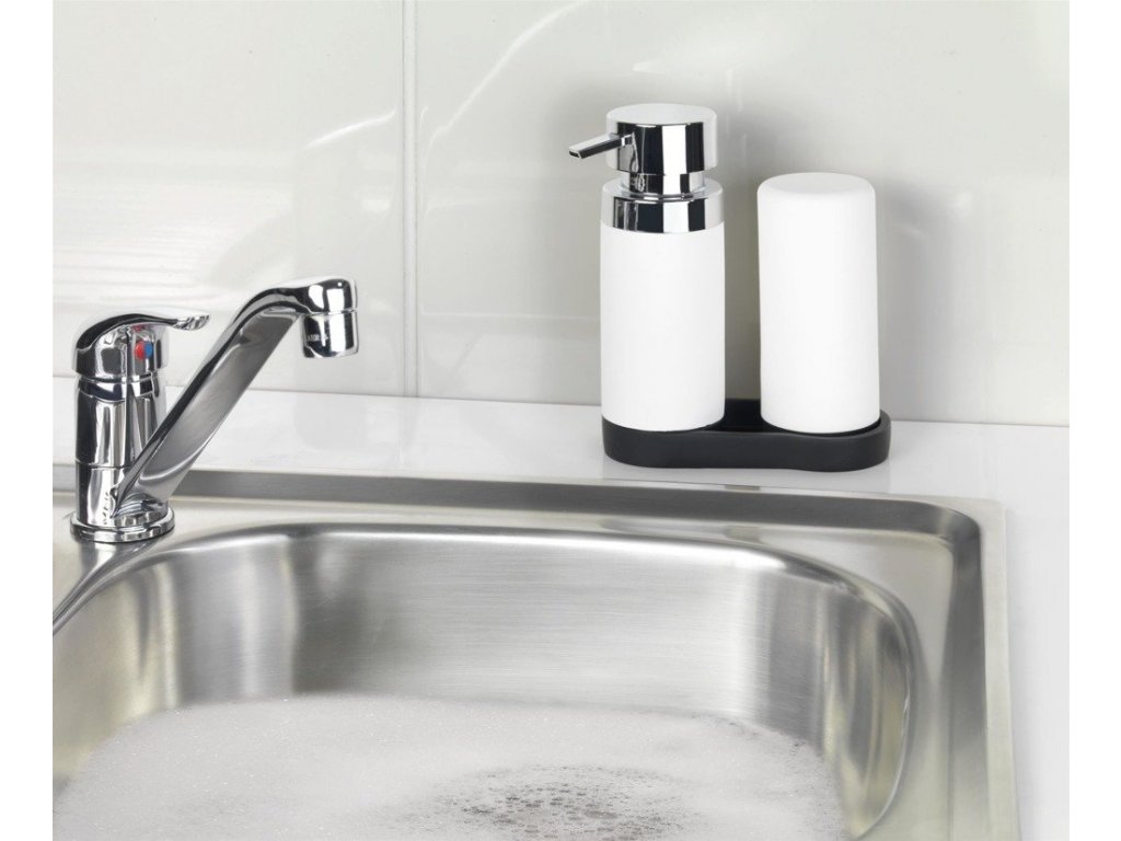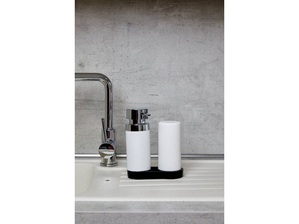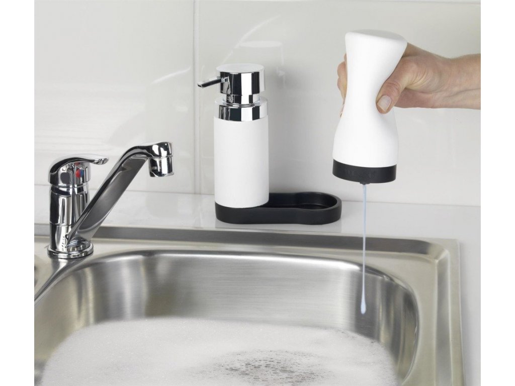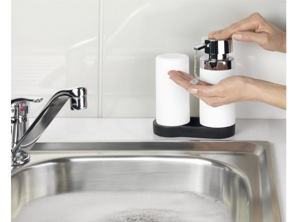 Pokud si ceníte pořádek na koupelnovém pultu nebo na poličce pod sprchou – vyzkoušejte tuto jednoduchou a elegantní sadu nádob. Díky ní budou potřebné kosmetiky vždy po ruce. Bude se hodit do koupelny využívající výrazné, kontrastní barvy. Základna je vyrobena z pevného materiálu. Obsahuje silikonovou nádobu a dávkovač s pumpičkou. Můžete je naplnit tekutým mýdlem, mycím gelem, šamponem nebo jinými kosmetikami, které chcete mít po ruce. Základna chrání nádoby před převržením na mokré sprchové poličce a usnadňuje jejich přenášení.