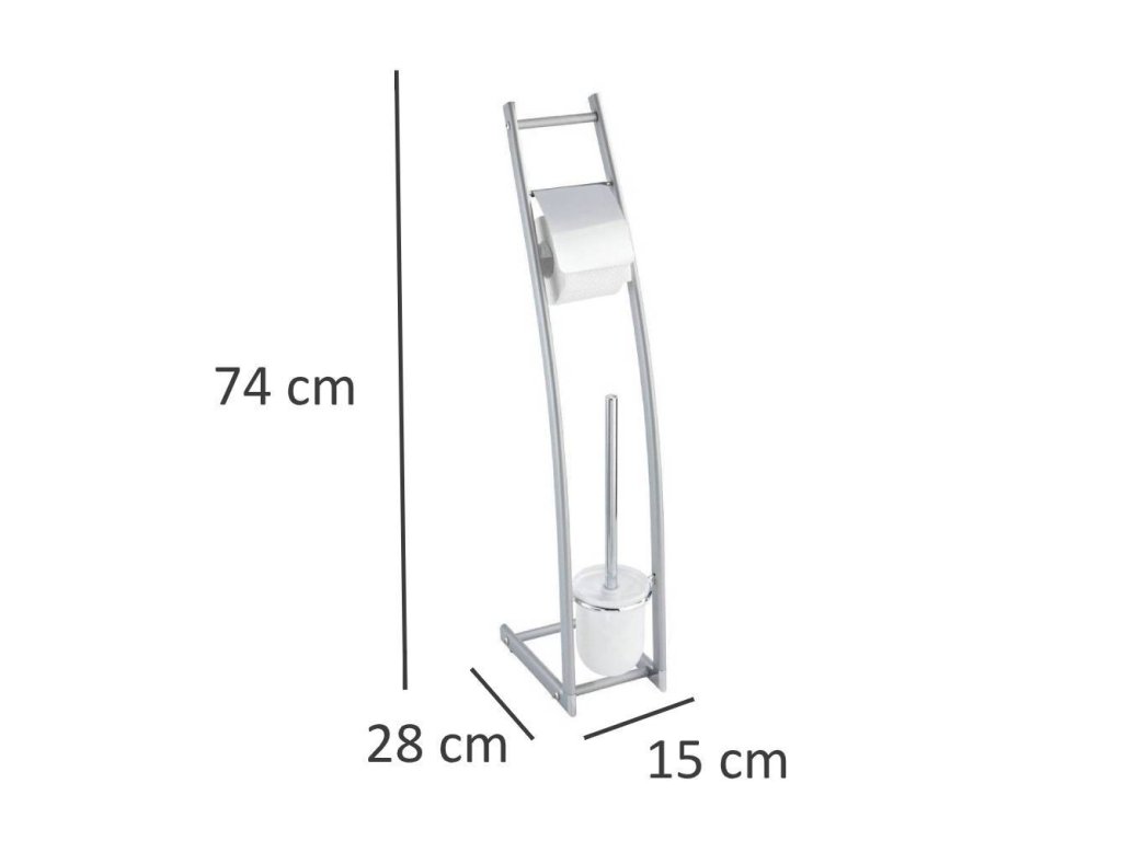Volně stojící stojan, který lze umístit na libovolné místo v koupelně. Představuje praktický doplněk koupelny, který spojuje dvě funkce do jednoho produktu. Toaletní papír i WC kartáč budou vždy přesně tam, kde jsou potřeba. I malá koupelna tak může být vkusně a funkčně zařízená. Držák je vyroben z hliníku, je lehký a snadno se s ním manipuluje. To umožňuje snadné čištění v jeho okolí. Stříbrná barva podtrhuje luxusní vzhled a kvalitní design.