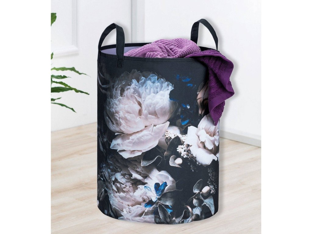 Koš v modré barvě s květinovým vzorem s objemem 55 L pojme značné množství špinavého oblečení. Produkt se neomezuje pouze na ukládání prádla: můžete jej také využít jako organizér na nepořádné kosmetiky nebo větší příslušenství, jako je kulma, fén nebo žehlička na vlasy.