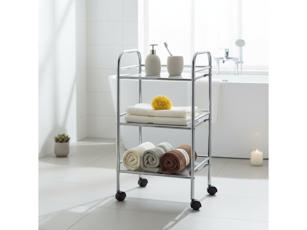 Praktický koupelnový vozík EXCLUSIVE na koupelnové potřeby, parfémy a ručníky. Pomůže zorganizovat prostor chytrým způsobem a přitom nezabere mnoho místa. Vybavený 3 policemi a 4 kolečky, které usnadňují přesun na jakékoli místo. Snadno se čistí hladký povrch. Určitě se skvěle osvědčí v malé koupelně a také v kosmetickém salonu nebo SPA. Elegantní design.