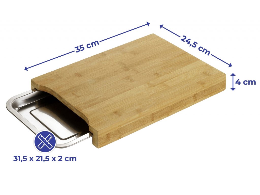 Řezací deska vybavenáocelovými podnosy je užitečným prvkem vybavení domácí kuchyně! Chtěli byste připravit pro své blízké speciální večeři, která se skládá ze zdravých ingrediencí samotných? Veškeré ovoce, zelenina, ryby nebo maso jsou pohodlně připraveny na praktické bambusové desce. Výrobek je navíc vybaven ocelovým podnosem , který překládá nakrájené nebo nakrájené přísady a přidá je do připraveného jídla. Deska je vyrobena z vysoce kvalitního přírodního bambusového dřeva . Výrobek díky svému pevnému zpracování bude sloužit uživatelům ve výborném stavu po dlouhou dobu. K dispozici je integrovaný ocelový podnos pod deskou, kde můžete uchopit nakrájené přísady bez nutnosti znečistit další nádobí. Produkt jistě osloví každého milovníka vaření!