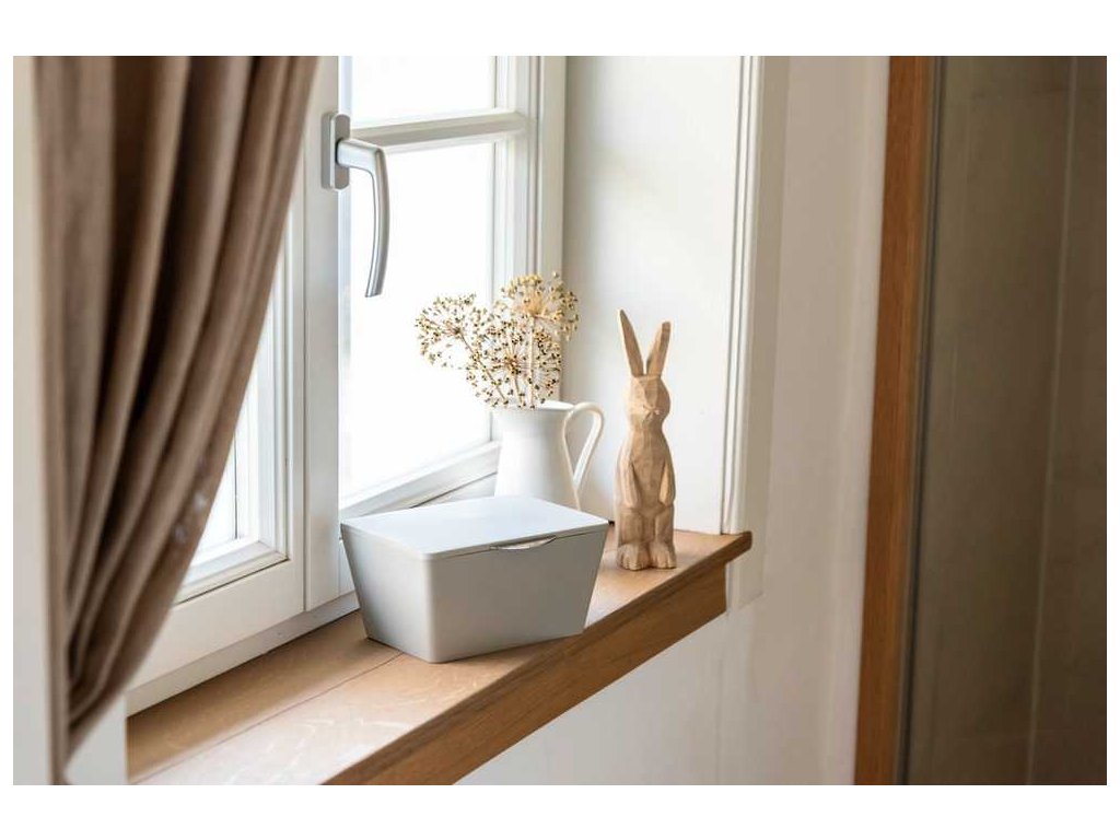 Rozměry nádoby jsou 15,5 x 10 x 19 centimetrů. Materiál z plastu zajišťuje, že nádoba skvěle zapadne do koupelny zařízené ve skandinávském nebo moderním stylu a je odolná vůči vlhkosti.