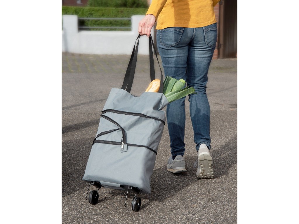Nákupní taška TROLLEY skládací, 3v1 je praktická nákupní taška, která nabízí velký prostor pro uložení a může být přeměněna na mobilní nákupní vozík během několika sekund. Díky funkci expandéru a integrovaným kolečkům taška usnadňuje transport každodenních nákupů: stačí otevřít zip, aby se zdvojnásobil prostor pro uložení.