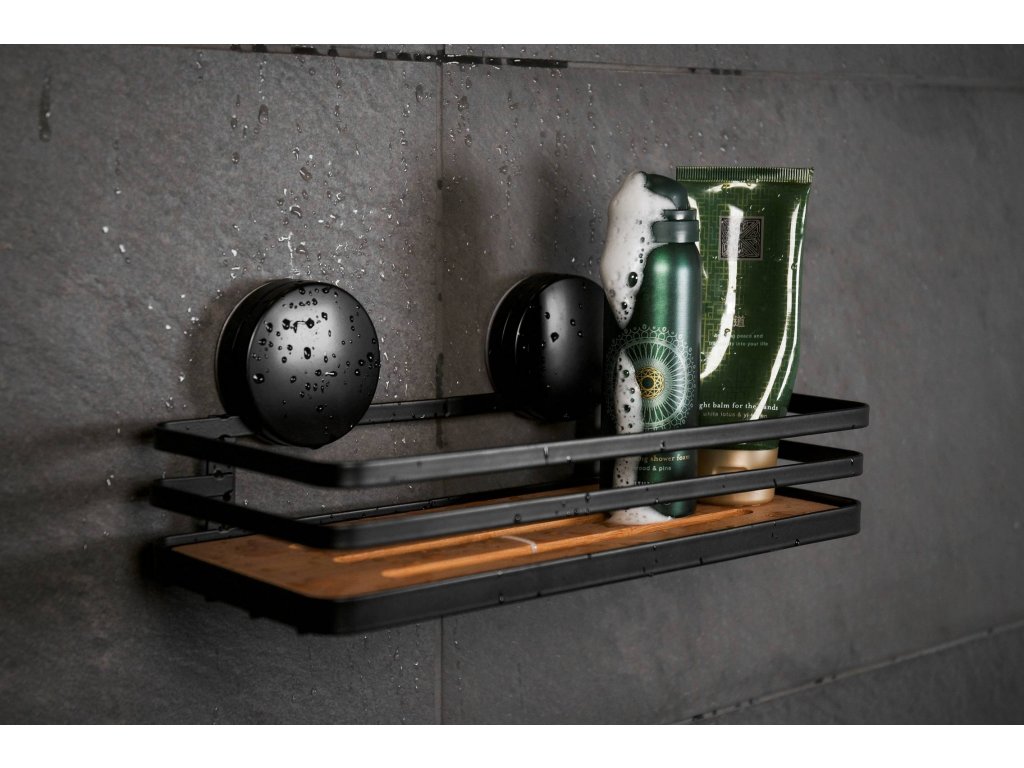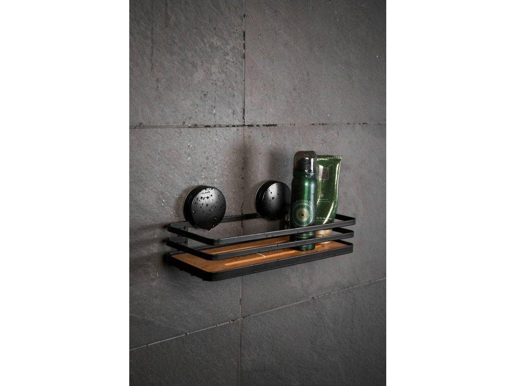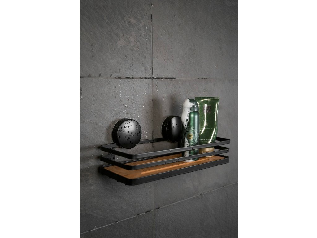Koupelnová polička ALBA kombinuje černou barvu s barvou dřeva. Kovová konstrukce je ideální do vlhkého prostředí koupelny. Materiál se snadno čistí, je trvanlivý a odolný proti korozi. Voda může volně protékat otvory v polici, takže mýdla, houby a další příslušenství můžou volně schnout. To je velmi důležité, aby se zabránilo vzniku plísní. Velký prostor na polici umožňuje umístit veškerou kosmetiku a koupací potřeby.