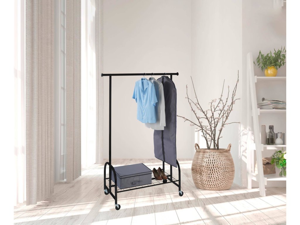 Stojací věšák na oblečení PROFI s policí na boty je produkt oceňované značky WENKO. Je vyroben z odolného a deformacím odolného kovu. Věšák má jednoduchou formu s jedním háčkem na zavěšení věšáků s oblečením a policí na boty. Je vybaven také kolečky, která usnadňují jeho přesun. Skvěle se hodí na zavěšení kabátů či bund a odložení bot.
